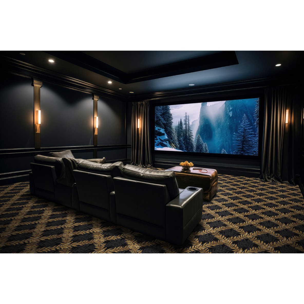Abingdon Trellis features an elegant vine trellis pattern that adds subtle texture and visual interest to the floor. Designed to elevate home entertainment rooms and movie theaters, it creates a refined yet inviting atmosphere. Its timeless design enhances the space without distracting from the on-screen experience.