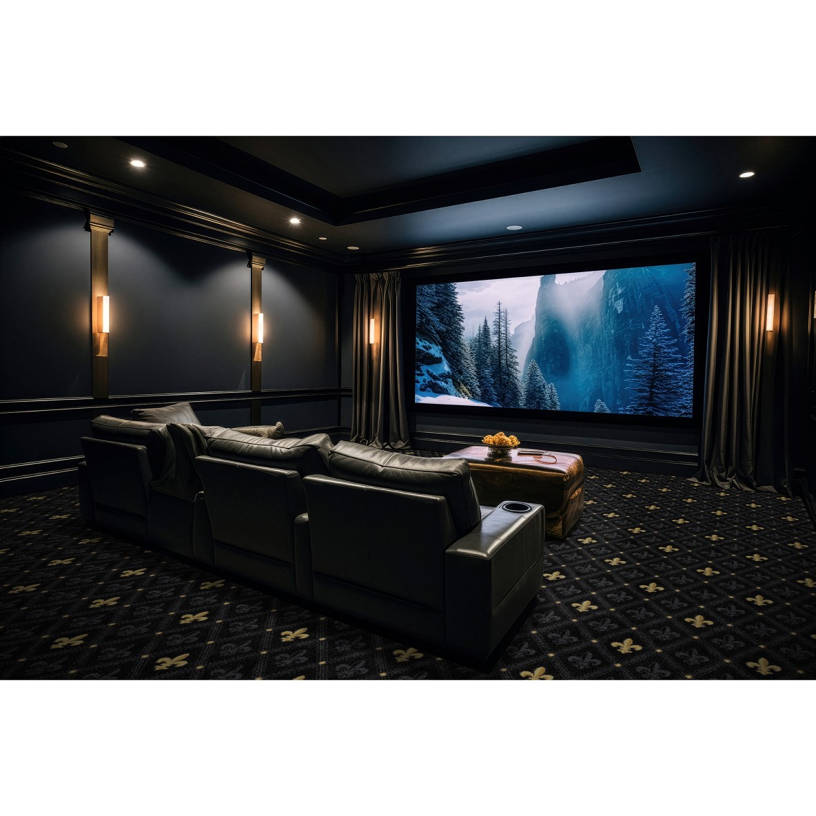 Chateau Royal features a refined fleur-de-lis pattern that brings timeless elegance to the floor. Designed for home entertainment spaces and private theaters, it adds character and sophistication without overwhelming the room. The classic motif creates a rich backdrop that enhances the overall viewing experience.