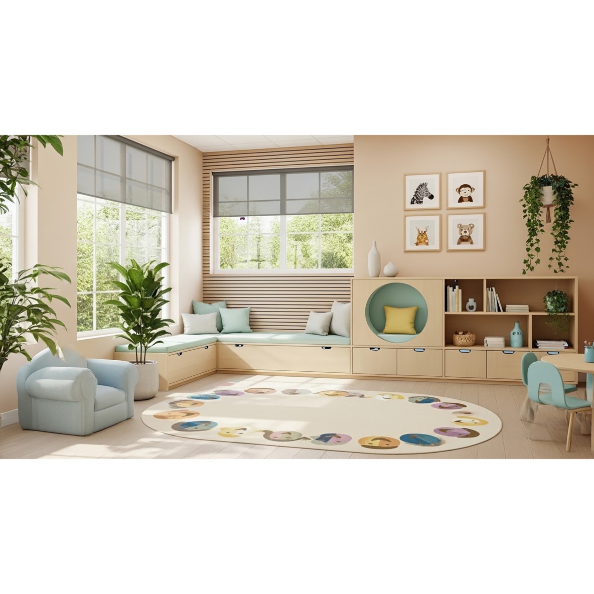 Faces of Joy celebrates happiness and connection with softly colored, smiling children’s faces forming a gentle border around a calm, neutral center. Designed to create a welcoming and emotionally supportive space, this rug encourages comfort, belonging, and positive social interaction in classrooms and daycares.