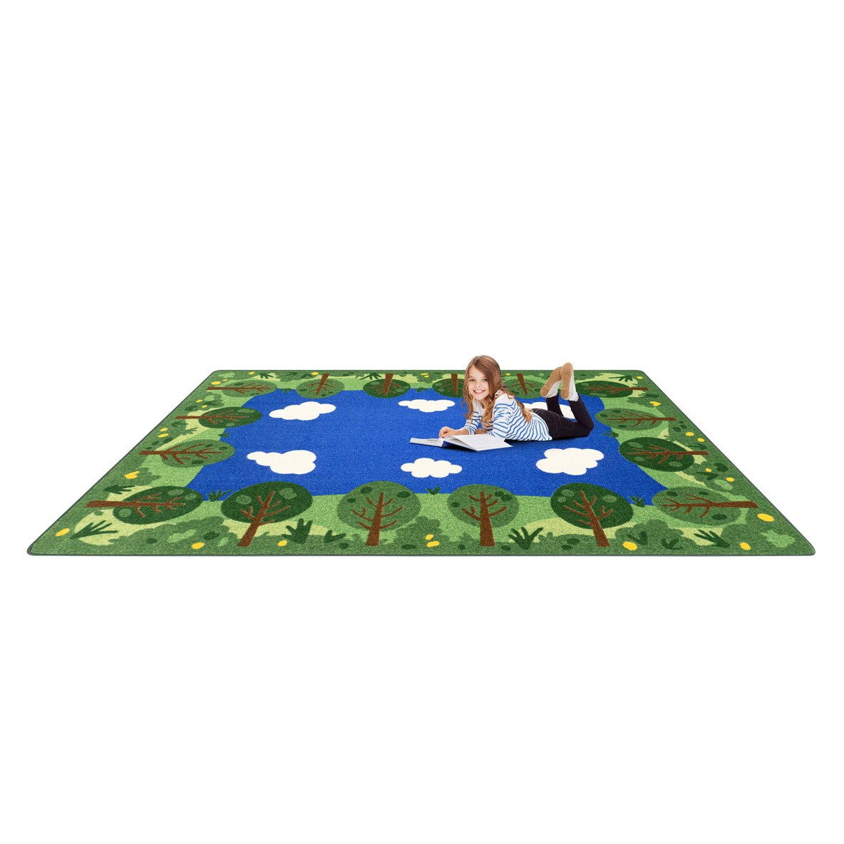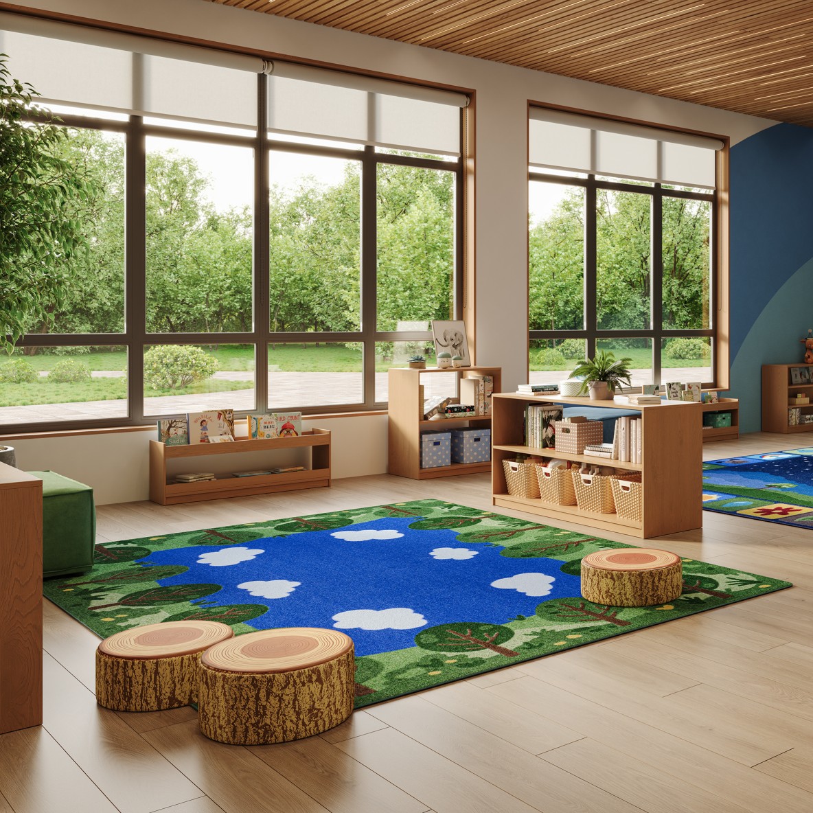 Turn any classroom or reading corner into an inviting world of imagination with this nature-inspired educational rug. Featuring a vibrant blue sky center framed by a cheerful forest border, it creates the perfect space for kids to gather, read, learn, and play.