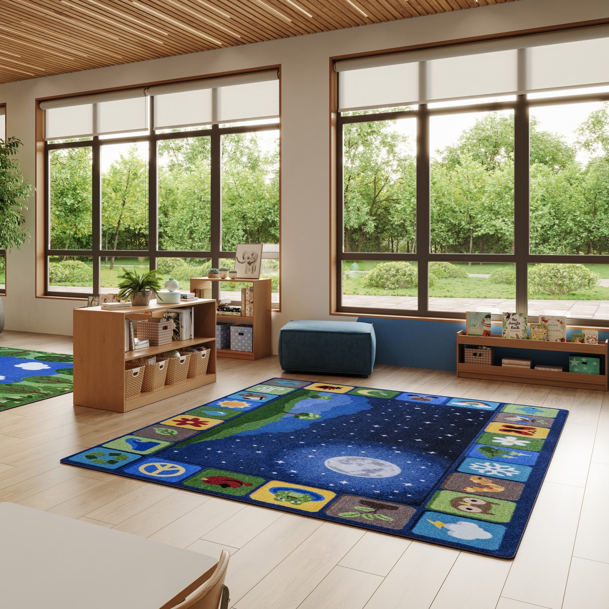 Peaceful Planet brings calm and curiosity into any space, with gentle animals and Earth-inspired details forming a soft border around a moonlit scene of stars, a grassy knoll, and two quiet trees. Designed to inspire imagination, comfort, and a sense of harmony with our world.